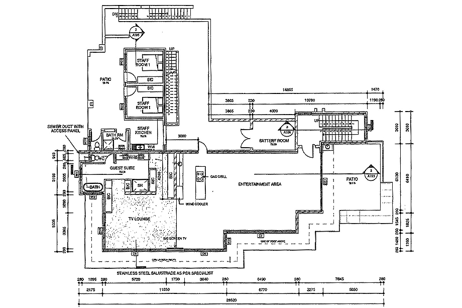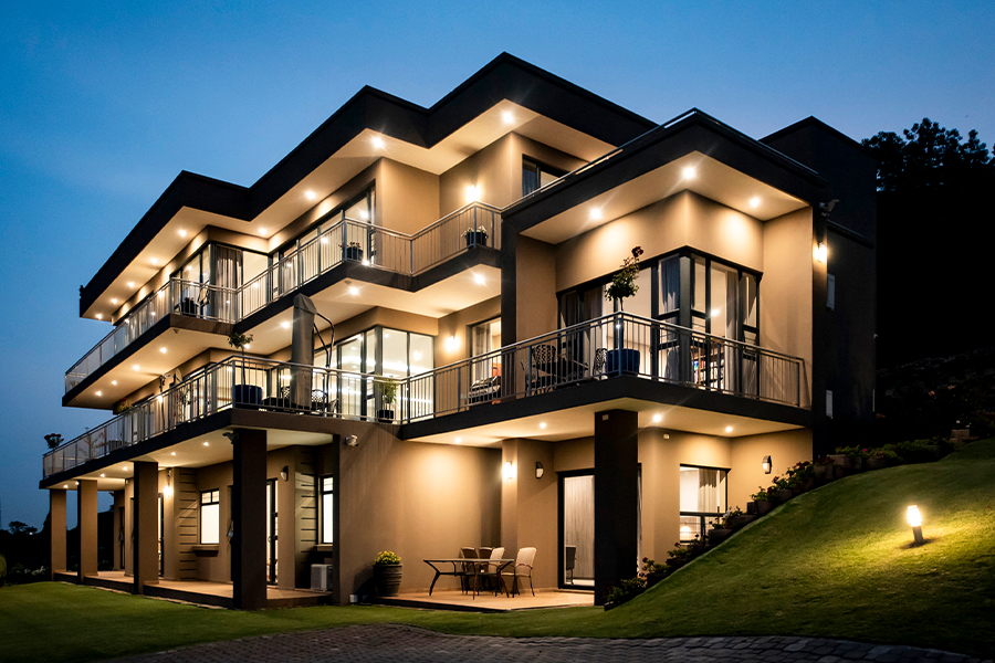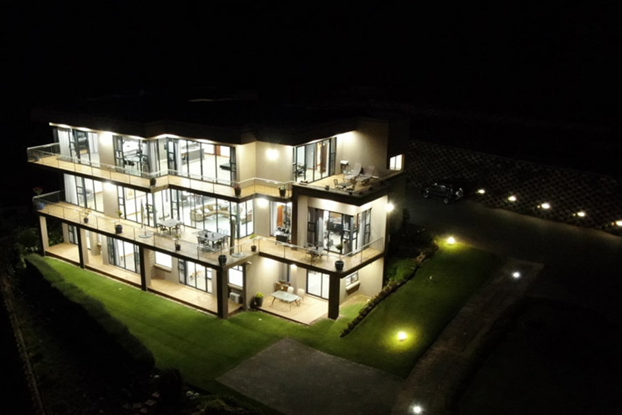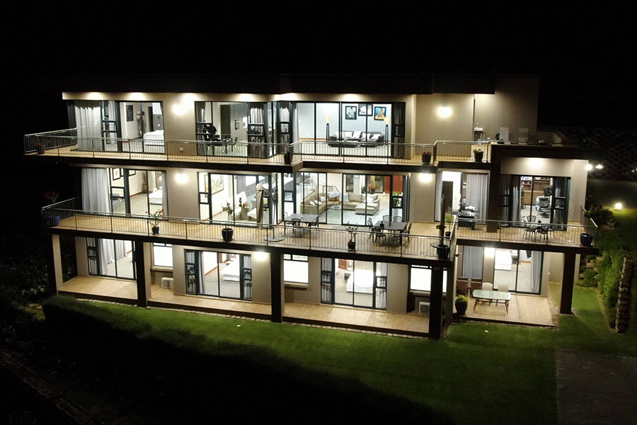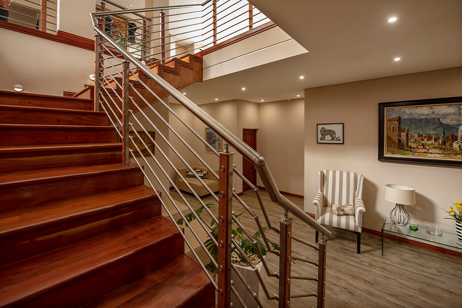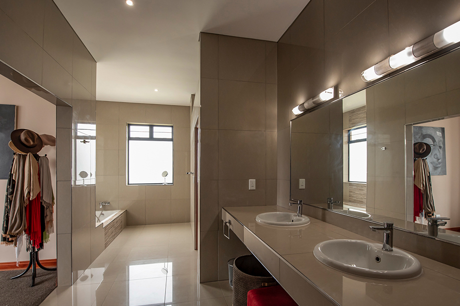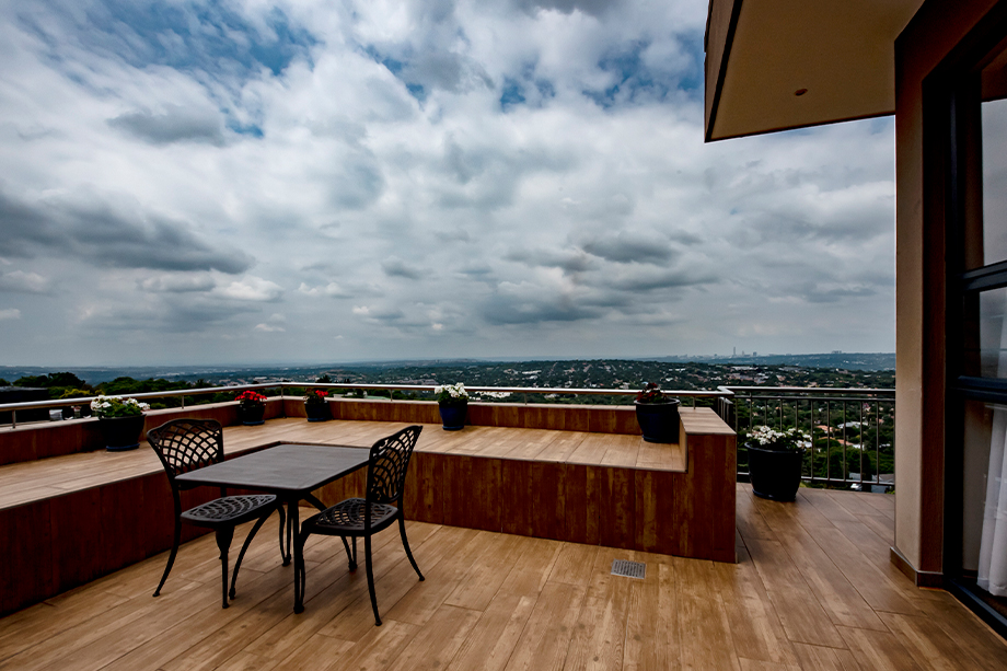The spacious bedrooms on this floor have full en-suite bathrooms and are equipped with an air conditioner, TV point and ample built-in cupboards. All the rooms open up on a small patio and access to the garden and have stunning views of the skyline of the northern suburbs of Johannesburg.