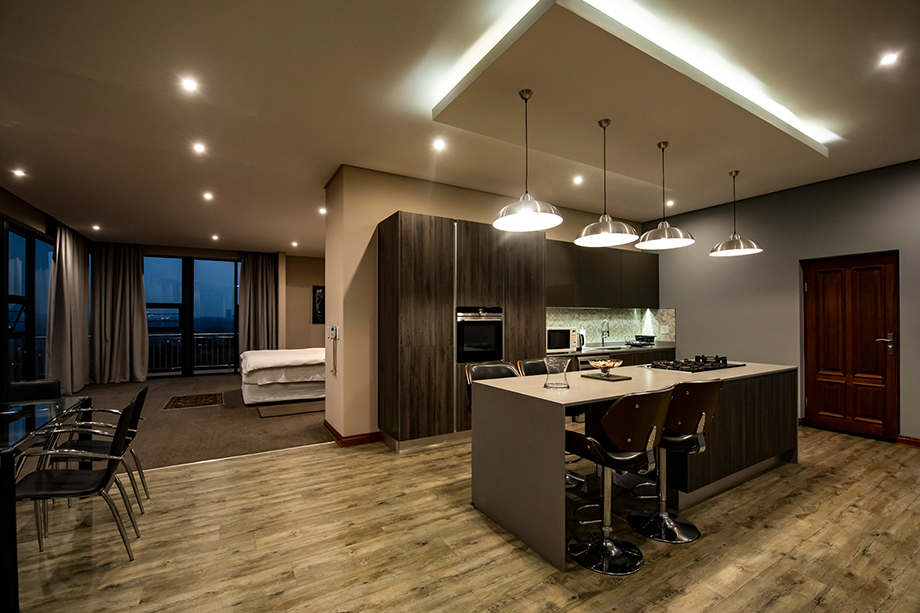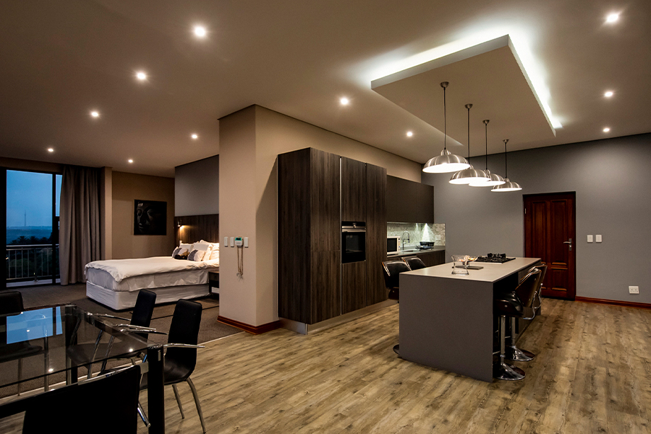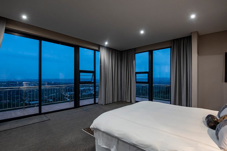 The large open plan, private and very spacious lounge, dining room and fully fitted kitchen, master bedroom and with a large full en-suite bathroom and is equipped with an air conditioner, 2 x TV points, ample built-in cupboards. The whole suite opens onto a large private patio and has the priceless views of the Johannesburg skyline and its northern suburbs of Sandton, Rosebank and Randburg that cannot be surpassed.