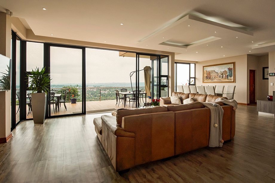 The open plan lounge, dining room and fully fitted kitchen, master bedroom and study all open onto a large patio and have million dollar views of the Johannesburg skyline and its northern suburbs of Sandton, Rosebank and Randburg.