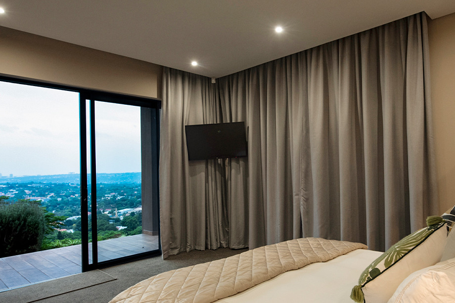 The executive study has a fully walled bookshelf and cupboards, but this room can also serve as a separate lounge or TV room. It has stunning views of the skyline of the Sandton, Rosebank and Randburg and opens up onto the patio.