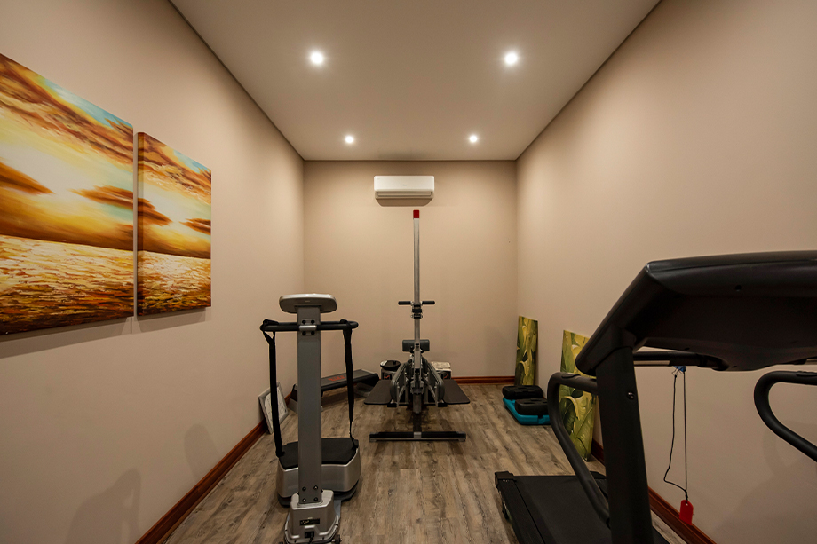 Dedicated fitness room with a treadmill, a stationary bicycle and a power plate.